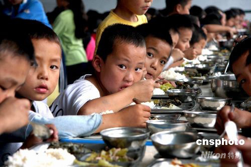 9月1日,四川阿壩州汶川地震災(zāi)區(qū)的600余名學(xué)生在瀘州市第十中學(xué)校經(jīng)過兩周的環(huán)境適應(yīng)后,正式進入過渡復(fù)課,圖為孩子們正在集體用餐,三菜一湯,吃得津津有味。中新社發(fā) 牟科 攝