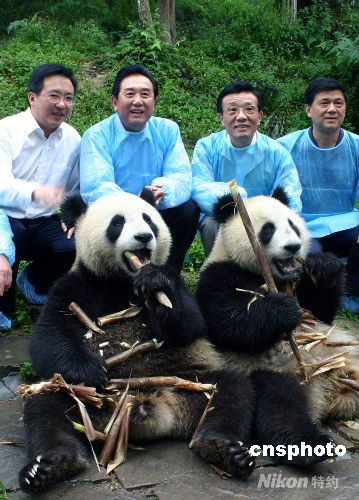 9月9日上午,海協(xié)會會長陳云林來到位于雅安的中國保護大熊貓研究中心碧峰峽基地,探望汶川大地震后轉(zhuǎn)移到這里的贈臺大熊貓“團團”和“圓圓”的生活情況,隨后,陳云林還參觀了熊貓幼兒園,探望了地震后出生的十三只小熊貓。中新社發(fā) 黃永莉 攝