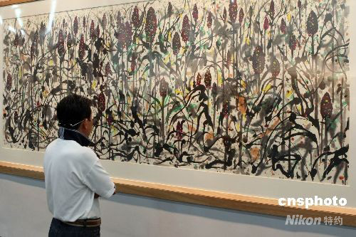 9月10日,2008上海藝術博覽會開幕。本屆藝博會吸引了來自中國、美國、法國等20個國家的140余家優秀畫廊前來參展。圖為吳冠中代表作《高粱》吸引參觀者。中新社發 湯彥俊 攝
