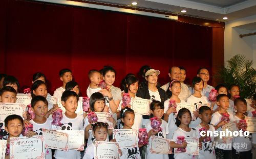 9月11日,香港華光功德會在綿陽成立“華光四川助學基金”,香港華光功德會的榮譽顧問袁詠儀、愛心大使趙薇與綿陽地震災區學生合影。中新社發 霍潺 攝