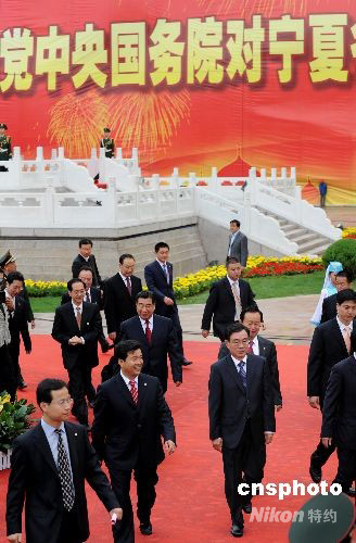 9月22日,中共中央政治局常委、中央紀委書記、中央代表團團長賀國強等,在銀川出席中央政府向寧夏回族自治區贈送民族團結寶鼎儀式。當日上午,以賀國強為團長的中央代表團乘專機抵達銀川,參加寧夏回族自治區成立50周年慶祝活動。中新社發 廖攀 攝