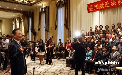 9月23日下午,抵達紐約的中國總理溫家寶與當?shù)厝A人華僑、中國駐外機構(gòu)代表和留學生等見面。中新社發(fā) 李靜 攝