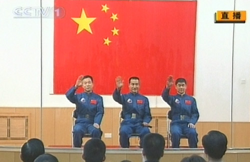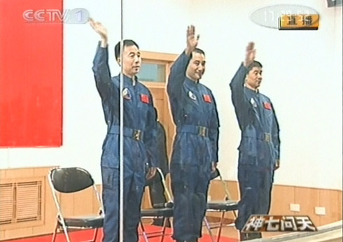 翟志剛(中)、劉伯明(右)、景海鵬組成飛行乘組執行“神舟七號”載人航天飛行任務。(央視截圖)