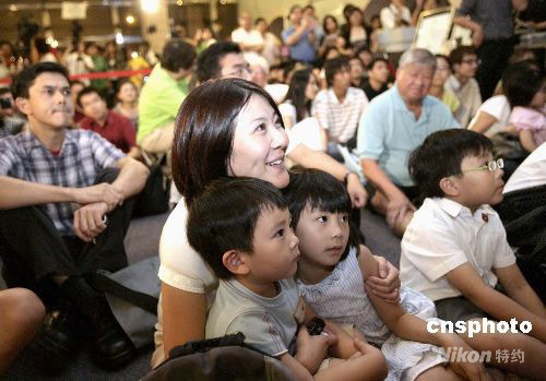九月二十五日晚,香港市民在太空館觀看“神舟七號”升空直播。中新社發 張勤 攝