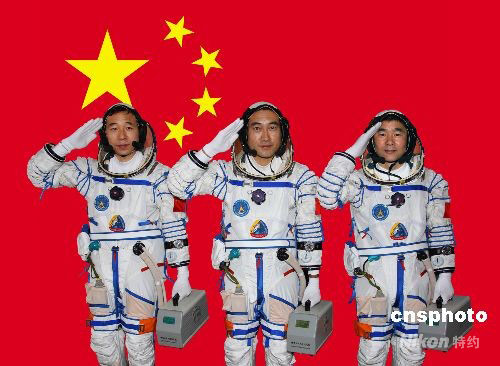 執行神舟七號載人航天飛行任務的航天員翟志剛(中)劉伯明(右)景海鵬(左)向祖國和人民致以莊嚴的軍禮。中新社發 秦憲安 攝