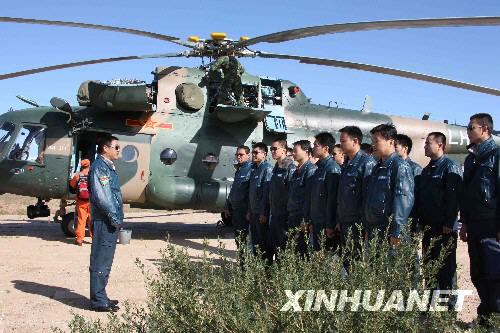9月26日,在內(nèi)蒙古四子王旗神舟七號飛船主著陸場,空中搜救分隊(duì)的直升機(jī)轉(zhuǎn)場至回收任務(wù)待命區(qū)。這是陸航某團(tuán)長、特級飛行員蔡有固在進(jìn)行戰(zhàn)前動(dòng)員。 新華社記者 王建民 攝