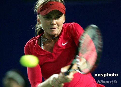 斯洛伐克美女選手漢圖楚娃以0比2不敵塞爾維亞選手揚科維奇,無緣四強。中新社發 富田 攝