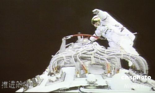 北京時間九月二十七日下午四點五十九分,神舟七號航天員翟志剛成功出艙,實現中國歷史上第一次太空行走。圖為攝于北京航天飛控中心大屏幕的在太空中的翟志剛。中新社發 齊彬 攝