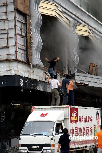 10月5日下午,廣西玉林市瑪田俱樂部在裝修過程中不慎起火,致使正在施工的21名工作人員被困火場,經玉州消防大隊官兵20多分鐘奮力撲救,大火被撲滅,受困人員得以安全疏散。圖為一被困女子跳下路邊貨車逃生。中新社發 黃詩斌 攝