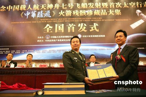 圖為第00081號《中華騰飛》火箭殘骸郵票珍藏品大集,贈送給中國軍事博物館永久收藏。中新社發 趙雋 攝