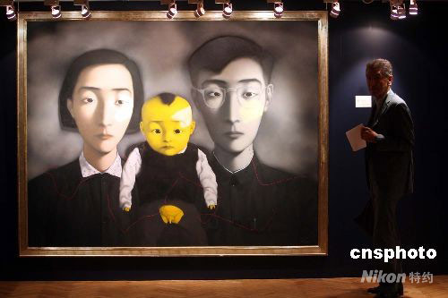 十月八日,香港佳士得推出一批即將在秋季拍賣的頂級當代藝術品,總值約四千萬港元,其中還有著名好萊塢導演奧利弗·史東(Oliver Stono)私人收藏的張曉剛油畫作品《血緣:大家庭之二》。佳士得表示,該藝術品沒有估價,屆時將由買家出價,價高者得。中新社發 洪少葵 攝
