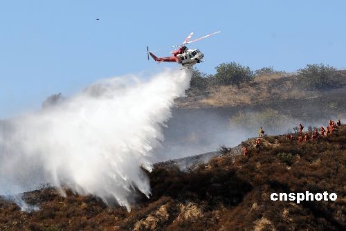 一架消防直升機在洛杉磯附近的山火現場實施空中滅火。中新社發 張煒 攝
