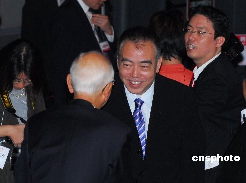 圖為陳凱歌在電影周開幕式上與日本同行寒暄,他被本屆東京電影節授予“黑澤明獎”。中新社發 侯宇 攝