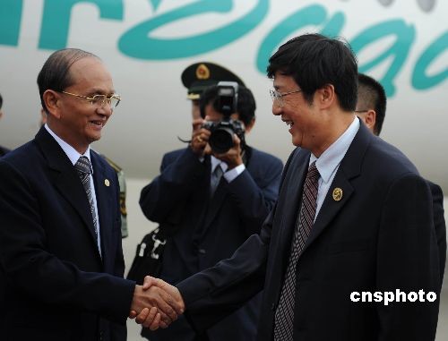 十月二十日,緬甸總理登盛飛抵廣西南寧,出席將于二十二日舉行的第五屆中國—東盟博覽會。他在南寧國際機場受到廣西官員的熱烈歡迎。中新社發(fā) 蔣雪林 攝