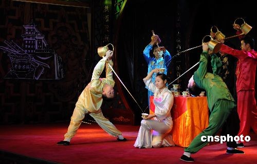 10月20日,北京老舍茶館內長嘴壺沏茶表演精彩絕倫。當日,文化部授予老舍茶館“國家文化產業示范基地”在店內揭牌。老舍茶館目前已接待幾十位國外元首政要,成為北京重要的文化產業基地。 中新社發 廖攀 攝