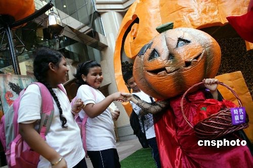 十月二十一日,兩名南亞小學(xué)生在香港時代廣場與南瓜人開心嬉戲。當(dāng)日,香港時代廣場為迎接萬圣節(jié)設(shè)置的“怪異南瓜陣”開幕,吸引許多游客駐足玩樂。中新社發(fā) 洪少葵 攝