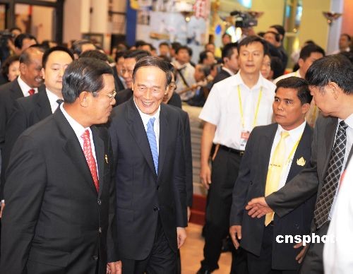 十月二十一日,中國—東盟博覽會主題國柬埔寨館舉行開館儀式。儀式結束后,洪森、王歧山共同巡視中國—東盟博覽會展館柬埔寨館。中新社發 蔣雪林 攝