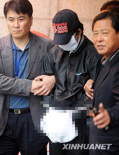 10月23日上午,韓國警方與20日在首爾某旅館制造縱火行兇事件的嫌犯鄭某(戴口罩者)到案發現場取證。新華社/韓國紐西斯通訊社