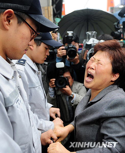 10月23日,韓國首爾某旅館縱火行兇案遇難者家屬在案發現場外悲痛不已。新華社/韓國紐西斯通訊社