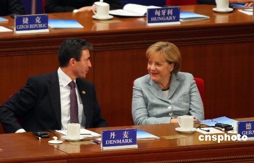 德國總理默克爾與丹麥首相拉斯穆森在開幕式上相談甚歡。中新社發(fā) 廖文靜 攝