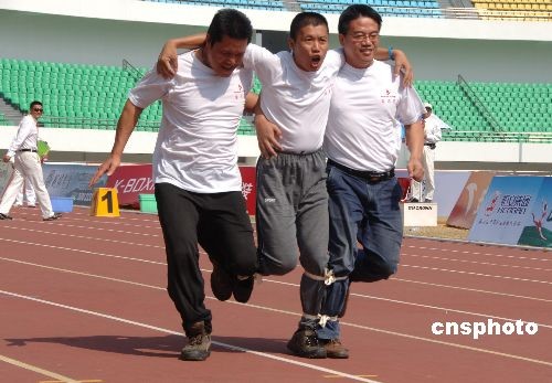 十月二十八日,臺(tái)灣選手邱學(xué)申、梁世英、汪勛武(中)在農(nóng)運(yùn)會(huì)“男子60米3人四足跑”比賽中同心協(xié)力爭(zhēng)向前。賽后汪先生在接受媒體采訪時(shí)說(shuō):這是他第二次參加全國(guó)農(nóng)運(yùn)會(huì),上一屆他是以臺(tái)灣游泳隊(duì)領(lǐng)隊(duì)身份參賽。中新社發(fā) 鄭祚聲 攝