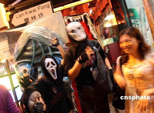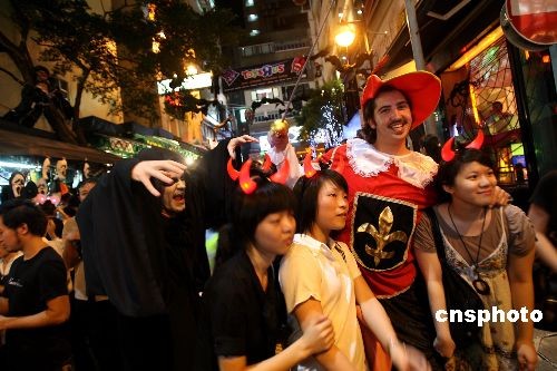 十月三十一日晚,香港中區(qū)蘭桂坊一帶人聲鼎沸,大批市民、游客在擁擠的酒吧街激情狂歡,歡度一年一度的西方“萬(wàn)圣節(jié)”。中新社發(fā) 洪少葵 攝