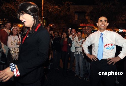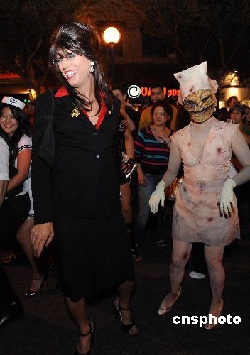 當地時間10月31日,萬圣節之夜,一位民主黨的支持者男扮女裝成佩林形象,在街頭巧遇民主黨總統候選人“奧巴馬”。“奧巴馬”始終以正面形象示人,而“佩林”慘遭惡搞。當晚,數十萬洛杉磯市民走上街頭參加萬圣節之夜大游行,西好萊塢的圣塔莫妮卡大道上“群魔亂舞”,面目猙獰的“妖魔鬼怪”帶來的不是恐怖而是快樂。中新社發 張煒 攝