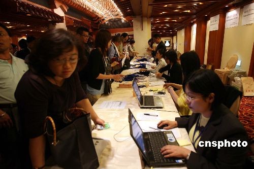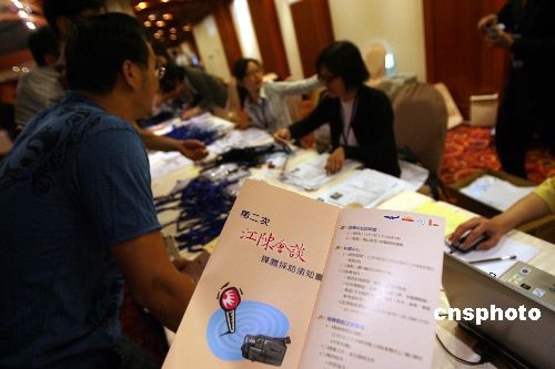 十一月二日,大批媒體記者在臺北圓山飯店新聞中心領取采訪證件。據悉,兩岸三地及海外的一百三十八家媒體共一千零四十七名記者報名,獲準采訪的記者有五百七十四名。中新社發 洪少葵 攝