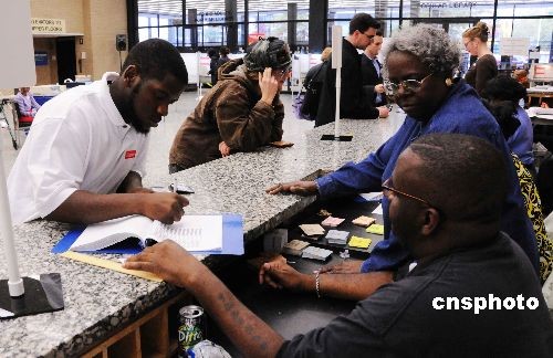 今年非洲裔居民百分之九十以上注冊成為選民。圖為一位非洲裔選民在華盛頓特區(qū)投票站填寫有關投票的表格。中新社發(fā) 邱江波 攝
