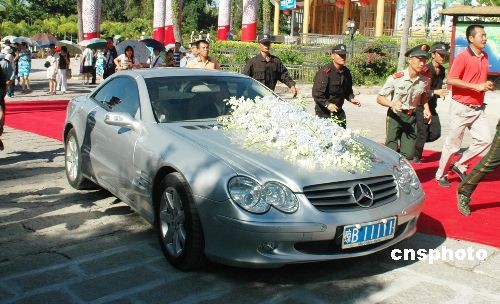 11月6日,2008北京奧運會體操“全能王”在海南三亞著名的天涯海角景區(qū)的沙灘上舉行盛大浪漫的婚禮,與新娘楊云經(jīng)過8年的愛情長跑,終于走進婚姻的殿堂。圖為楊威迎娶楊云的豪華婚車。中新社發(fā) 尹海明 攝