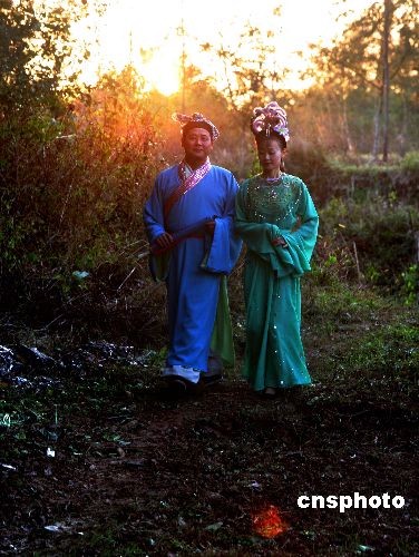 安徽黃山市一旅游景點上向游人表演黃梅戲《天仙配》,展示當地文化。中新社發 宋吉河