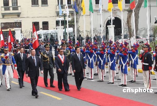 當地時間11月20日,中國國家主席胡錦濤在秘魯國會大廈前檢閱秘魯三軍儀仗隊。中新社發 齊彬 攝