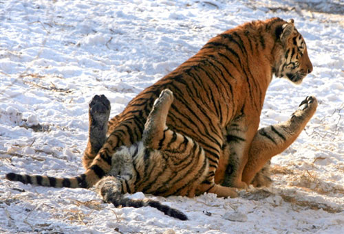 最不怕冷的“情侶”——1月,哈爾濱東北虎公園內兩只老虎在戲耍。