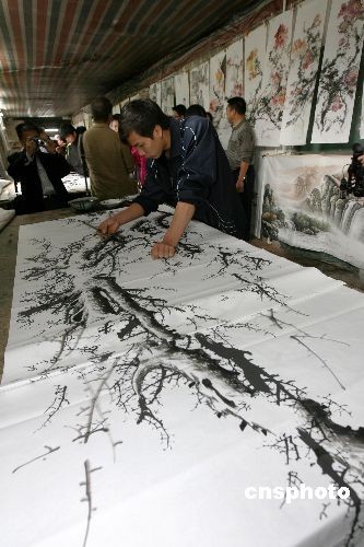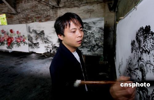 著名的奧運之鄉、全國舉重之鄉廣西桂林五通鎮,依靠桂林常年旺盛的游客資源,農民繪畫產業蓬勃發展。全鎮800多農民從事繪畫,年產值達8000多萬元,成為名副其實的藝術之鄉,全國文化(美術)產業示范基地。中新社發 王麗南 攝