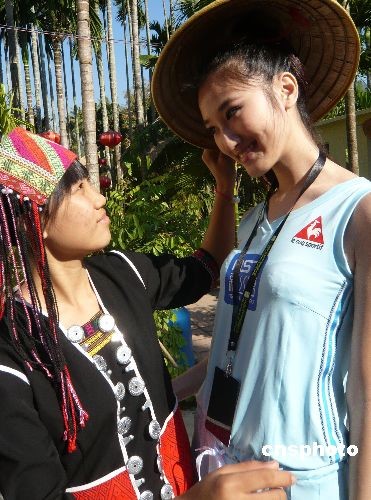 12月2日,正在海南三亞舉行的2008新絲路中國模特大賽總決賽的參賽選手進行賽事活動,參賽的49名男女選手來到美麗的三亞檳榔河生態(tài)新村參觀。圖為黎族姑娘為參賽佳麗戴上斗笠。