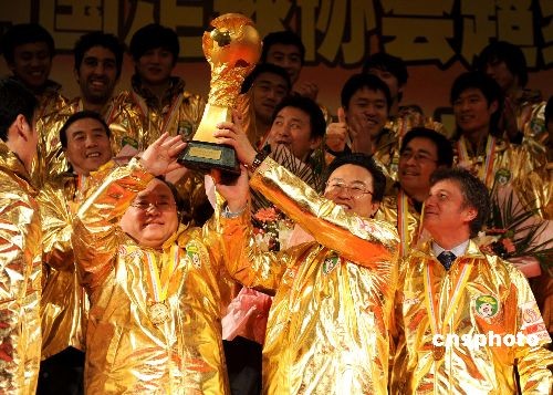 12月4日,2008中國足球協會超級聯賽頒獎典禮在山東濟南舉行。冠軍球隊山東魯能泰山全體將士登臺舉起火神杯。