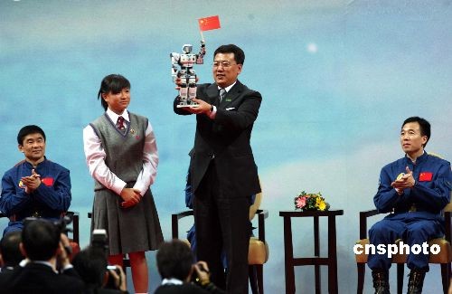 圖為澳門學(xué)子向“神舟七號”載人航天飛行代表團贈送航天機器人。中新社發(fā) 武仲林 攝