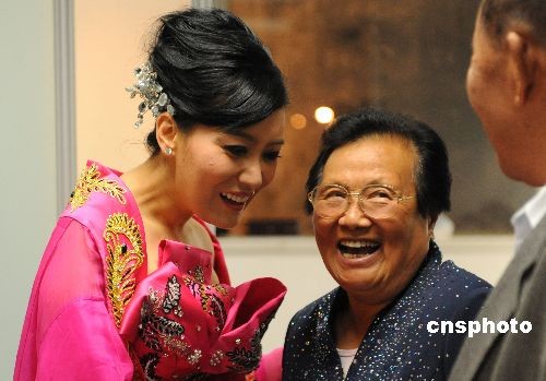 12月9日,和諧之聲——譚晶深圳獨(dú)唱音樂會在深圳音樂廳舉行。圖為鄧小平之妹鄧先群到后臺祝賀譚晶演出成功。中新社發(fā) 廖攀 攝