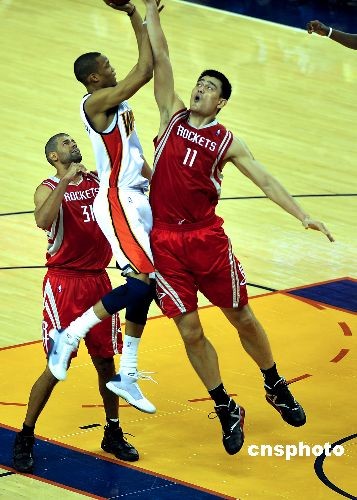 圖:姚明奮力阻攔金州勇士隊的進攻