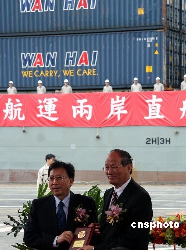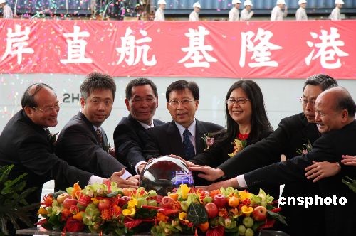 12月15日上午,臺(tái)灣行政當(dāng)局負(fù)責(zé)人劉兆玄率同“陸委會(huì)主委”賴幸媛、海基會(huì)副董事長(zhǎng)高孔廉、“交通部次長(zhǎng)”游芳來(lái)與臺(tái)灣知名航商負(fù)責(zé)人共同出席“兩岸海運(yùn)直航基隆港首航儀式”。