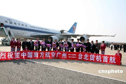 由中國南方航空股份有限公司執(zhí)飛的兩岸首架直航貨運包機,于十二月十五日下午十五時從廣州白云國際機場起飛,預計飛行一小時四十五分鐘后降落臺北桃園機場。 該架貨機型為目前世界上最先進、最大型的波音七四七-四零零F全貨機。中新社發(fā) 羅廣泰 攝