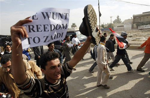 14日,伊拉克記者扎伊迪在招待會上向布什扔出自己的鞋子,并高聲辱罵布什。憑借此舉扎伊迪一夜成名,成為整個阿拉伯世界的“斗士”。