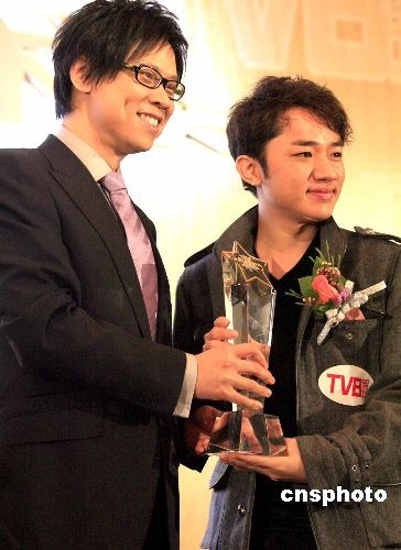 十二月十七日,《TBV周刊》2008最強人氣品牌大獎頒獎禮在香港舉行。圖為無線電視總經理陳志云(左)為2008最強人氣廣告新人王王祖藍頒獎。中新社發 張勤 攝