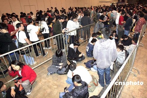 十二月十九日,一年一度的“亞洲游戲展2008”在香港會展中心舉行。圖為游戲迷們早早來到門口排隊等候進場。中新社發 張勤 攝