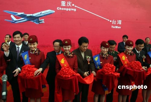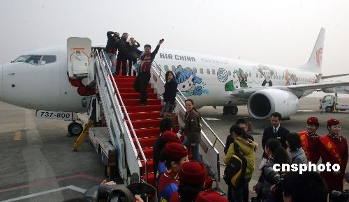 12月19日,重慶至臺(tái)北的直航航線正式開通。當(dāng)日下午3時(shí)許,印有福娃圖案的國航班機(jī)從重慶江北機(jī)場(chǎng)起飛,駛向?qū)殟u臺(tái)灣。中新社發(fā) 郭晉嘉 攝