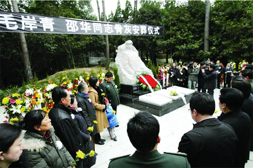 松濤陣陣,天地含悲。昨日下午,省委常委、省委秘書長楊泰波,省委常委、省軍區政治委員楊忠民,省委常委、長沙市委書記陳潤兒,軍事科學院原院長、上將劉精松,軍事科學院原副院長、中將糜振玉、錢海皓,總參管理保障部政治委員、少將黃斌,軍事科學院政治部副主任、少將陳金泉,解放軍藝術學院原政治委員、少將喬佩鵑,總參軍訓和兵種部副政治委員、少將宋舉浦,軍事科學院外軍部副部長、少將肖裕聲,毛岸青、邵華同志的兒子毛新宇,兒媳劉濱,孫子毛東東,親屬劉松林、張少林、李天策、蔡振霞、楊相國、毛岸平,市領導陳澤琿、楊懿文,以及各有關代表,毛岸青、邵華同志的生前好友120余人,緩緩來到楊開慧烈士陵園西側毛岸青、邵華同志的墓前,出席這對相濡以沫47年的革命伴侶的骨灰安葬儀式。大家胸前別著寄托哀思的白花,冒著凜冽的寒風,和在風中張開懷抱的青松翠柏一起,迎接毛岸青、邵華同志的歸來。