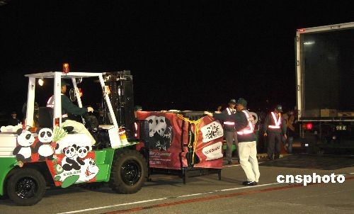 大陸贈(zèng)臺(tái)大熊貓“團(tuán)團(tuán)”、“圓圓”在臺(tái)北桃園機(jī)場被裝上專車,即送往臺(tái)北市動(dòng)物園,入住新家。