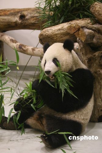 大陸贈臺一對大熊貓“團團”和“圓圓”12月23日晚間抵達臺北,住進臺北市立動物園的新光特展館。圖為雄性大熊貓“團團”抵達新家半個小時后抱著臺灣箭竹大快朵頤。這是它在新家的第一頓飯。 中新社發 路梅 攝