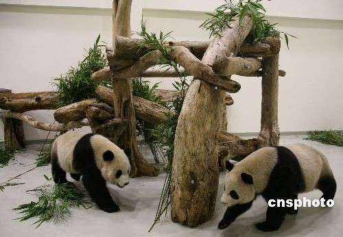 圖為經歷了一天旅途勞頓的“團團”和“圓圓”在新房間里團聚。 中新社發 路梅 攝