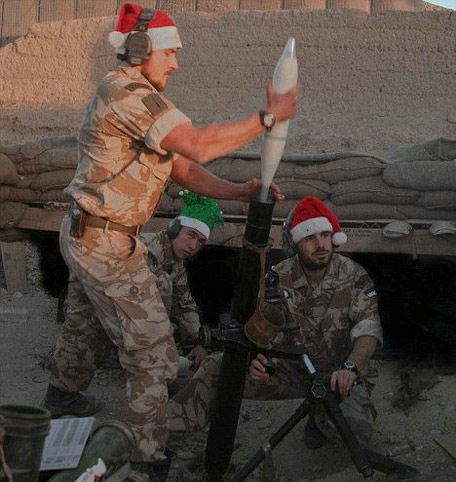 圣誕帽、迫擊炮兩者結(jié)合令場面顯得非常怪異。